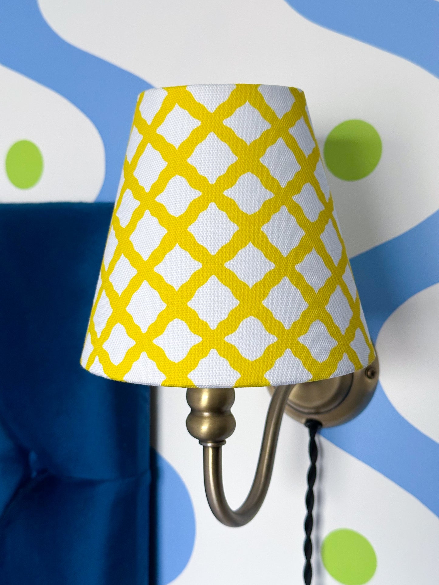Made with my yellow 'Trellis Charm' pattern in 100% cotton material (outside), this candle clip lampshade brings a touch of charm and elegance to any room. The lampshades can be used with ceiling, wall or table lamp fittings, and they clip over standard candle bulbs. Available to order with or without a bright yellow pom-pom trim.